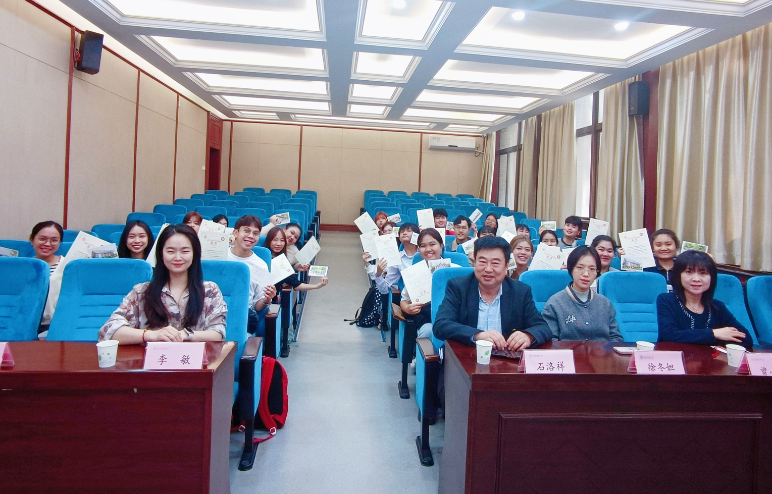 2023年10月27日上午,泰国孔敬大学短期中文研修班结营仪式在52av 一层多功能报告厅举行,52av 院长石洛祥、教师代表曾小梦、学院办公室工作人员及来自泰国孔敬大学的21名学员参加了结营仪式。仪式由52av 副院长李敏主持。52av 院长石洛祥总结了项目情况。石院长表示无论从课程开展还是学员学习情况来看,这次项目都是一次成功的汉语研修项目、一次成功的文化交流活动、一次...
