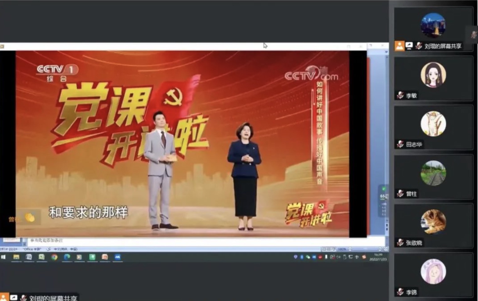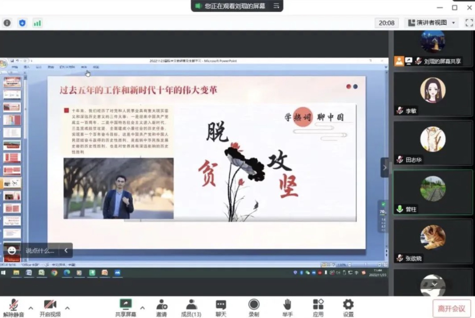 活动的开始,党支部书记刘琨回顾了整个十一月带领全体教研组教师在线上开展“党的二十大报告全文内容领学计划”的进行情况,对党的二十大报告进行了整体解读,强调了学习党的二十大精神的重要意义。党员曾柱联系微课《学热词,聊中国》的设计思路,分享了对新时代共产党领导群众打赢“脱贫攻坚”战的感受和理解,认为中国的脱贫攻坚对世界减贫事业具有重大意义,同时作为汉语教师,应思考如何把思政元素恰当融入语言教学。党员田志华也分享了对学习计划中个人领读部分的学习感受,她认为党的二十大报告之过去五年的工作和新时代十年的伟大变革这一部分的谋篇布局证明了党的高瞻远瞩,在过去五年所取得的工作成就中,最值得赞叹的是面对百年未有之大变局,党应对重大风险挑战所具备的勇气与智慧,这是全体中国人民战胜困难时勇气和自信的来源。刘琨则总结了报告中十年来党和国家艰苦奋斗,进行伟大变革的16个方面和6个标志性内容,认为要把报告中体现的精神内核融入和体现在工作学习生活中来。