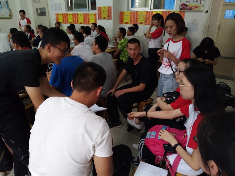 随后暑期实践团队成员与民勤一中高二弘毅班进行了交流座谈。首先,团队成员结合自身经历从大学生活的点点滴滴和当地同学进行了深入的交谈,针对学习技巧与考试方法为同学们答疑解惑。随后,团队成员为当地同学发放了我们精心制作的宣传册,并结合学校特色对免费师范生政策进行了宣讲与解读。在互动环节中,当地同学带着对大学生活的憧憬与向往,积极提问,踊跃发言,现场气氛活跃。最后,全体团队成员为同学们送出了祝福和寄语,并与全体同学合影留念。此次交流让我们近距离地了解到了民勤县的基础教育现状,充分认识到当地民众对教育的重视,对知识的渴求,也让我们更加坚定了此次社会实践的决心。