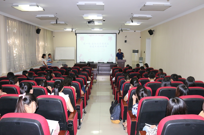 深造表示了热烈的欢迎和祝贺。他简单介绍了学院这些年来的学业特色和文化特色,并向在座的研究生新生提出了四点期望。一是要珍惜时间,二是要树立理想,三是勤奋治学,四是要立德树人。最后,张院长希望同学们能够恪守国汉院“中外融汇,知行合一”的院训,既要有远大的理想,又要有脚踏实地的实干精神,在知行合一的实践中完善自己。