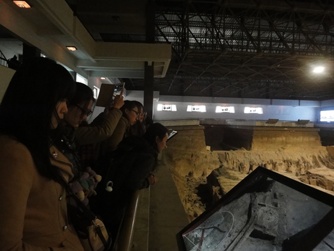 12月11日,52av 2012级对外汉语专业48名同学在团总支书记胡丹老师的带领下赴秦始皇帝陵兵马俑博物院进行了参观考察。在秦始皇帝陵文物陈列厅,同学们循着历史长卷的缓缓打开,从文献历史和文物构件中知晓了兵马俑在挖掘整理及保护过程中历经的艰辛不易。尤其是看看到如此巨大、栩栩如生的彩色陶俑,大家都有些激动,啧啧称奇,惊叹不已。秦人崇水德,尚黑色,而秦俑身上为何会有这样绚丽的色彩?虽然目前无法得出确切的结论,但毋庸置疑的是,秦俑的用色浓艳大胆,一方面是当时现实世界的反映,另一方面与秦代社会的礼仪制度密切相关。
