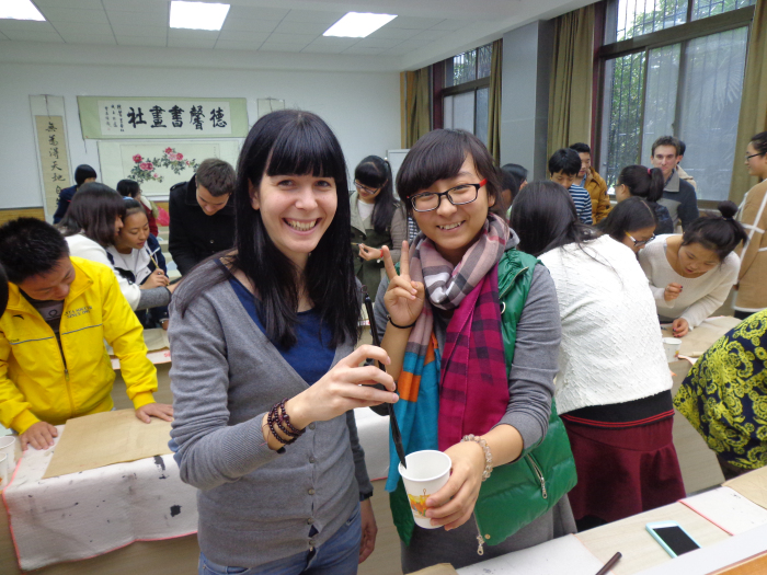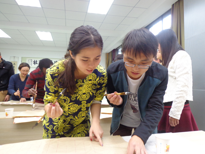 来自意大利、韩国、哈萨克斯坦、加纳等国家的留学生们在书法老师手把手地演示下,频频发问。