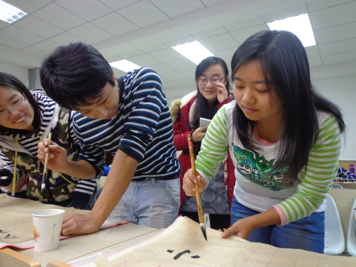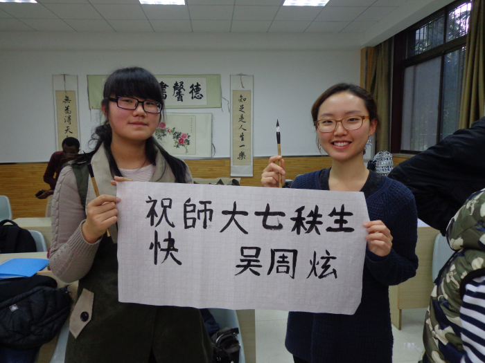 由于以前从没见过毛笔,留学生们刚拿起笔来还有些笨拙和不习惯,但真正练起书法来却挺有天分。来自哈萨克斯坦的留学生小龙跟着老师学了汉字书法点、划、撇、捺。当经过一个多小时的汉字基本笔画练习后,他就可以运用毛笔来创作自己的作品了,有模有样地为母校生日泼墨挥毫——
