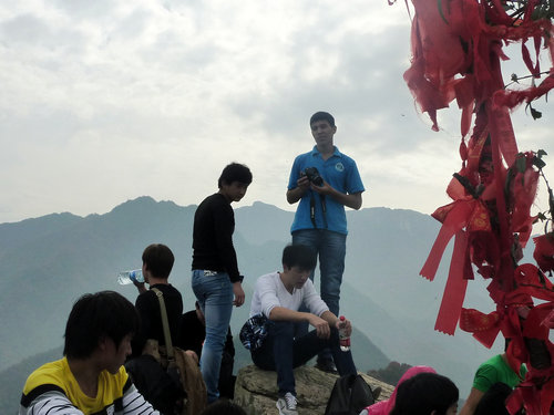 半山腰有当地人卖山货土产,来自哈萨克斯坦的东干族留学生就奋勇当先地操着一口纯正的陕西话与商贩讨价还价,聊的热火朝天,其他国家的学生见状也不甘示弱,纷纷用汉语大胆上前交谈。留学生们在学校所学的汉语此时纷纷派上用场,好不热闹。山路艰辛,但登上山顶的畅快无可比拟。俯视山下,天池风光尽收眼底,旁边一片石林,头顶绿枝红叶,摇曳生姿。