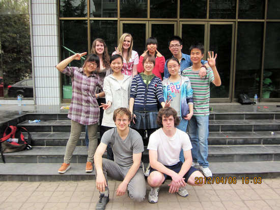 首先进行的是“抓沙包”的游戏。游戏中,两个同学作为“攻击者”站在广场的两端,其余的同学则站在场地中央作“靶子”。“靶子”们要想方设法地躲避“攻击”,并要竭尽全力去抓住沙包。如果成功了,那么就赢了;输了就要接受惩罚。被惩罚的两个女生因为、害怕响声,捂着耳朵,背靠背挤破了一个气球。别看留学生们是初次接触这个游戏,但他们却毫不逊色。他们充分的利用了自己的身高优势,其中更是不乏笑料。虽然几乎每个人都被砸到过,但输赢在这时已经没有那么重要了,大家能够在此过程中增进相互之间的了解和友谊,这就足够了。