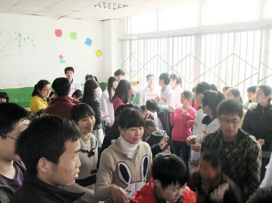 接着,志愿者们开始耐心的跟孩子们交谈,教他们使用一些简单的工具以培养他们的生活自理能力,给他们剥糖吃。有的孩子能叫他们一声哥哥姐姐,虽然发音不清晰,但足以让志愿者们感到欣慰;有的孩子一边说话一边流口水,志愿者便不厌其烦地给他们擦,告诉他们把纸放在口袋里;有的孩子则非常调皮,拽着哥哥姐姐们玩。像这些対普通孩子来说十分简单的动作,却要给他们重复好多遍才能让他们记住。望着孩子们那双水灵灵的眼睛,志愿者就像他们的亲人一样,细心呵护着他们,给他们的心灵上送去温暖。快乐的时光总是短暂的,一眨眼的工夫,两个小时的志愿活动已经接近尾声,而教室里也充满了浓得化不开的情谊。志愿者们紧握孩子们的小手跟孩子们依依不舍地告别,心中默念着:我们会再来的。