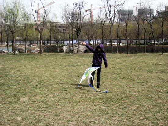 但放风筝并不是件对人人来说都容易的事。有的组可以把风筝放的很高,有的组的风筝怎么也飞不高,还有的组把大部分时间花在了理线上,忙的焦头烂额。当然,这也与风筝的结构和引线的材质有关。约莫半个多小时后,大家已觉尽兴,三三两两踏上归程。