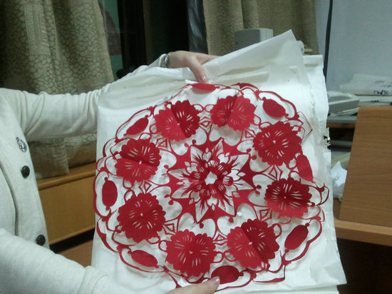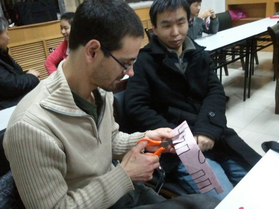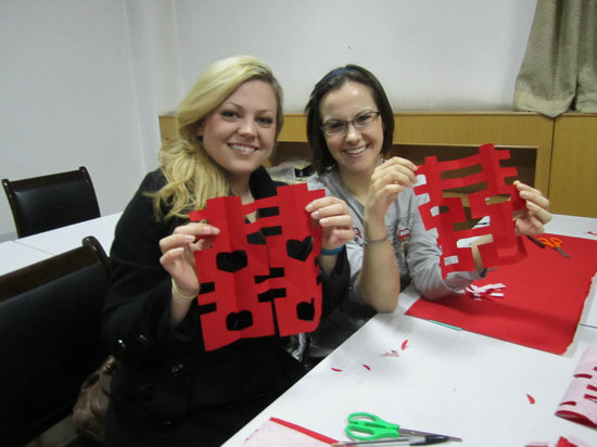 活动中,主持人通过幻灯片给同学们介绍了剪纸的历史发展状况,大家被惟妙惟肖的剪纸作品深深吸引,都看着准备好的红纸和剪刀跃跃欲试。剪纸高手王瑾同学应势做起了大家的现场教学老师, “喜”字、“腊梅”图,抱福娃等吉祥图案在她的手下活灵活现,大家都拍手称赞。然后王瑾同学教大家如何剪“喜”字,从折纸到到如何去剪,一步一步讲解的非常清楚详细。几位现场的留学生们也忙得不亦乐乎,在剪纸上又折又画,有的把该留下的部分剪了下来,有的则剪得非常富有中国韵味,还有的干脆自己进行创新。王瑾同学对大家的剪纸作进行了点评,难决胜负。