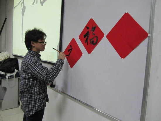 第二项活动是书法展示,曾庆炳同学在向大家简单介绍了书法的入门技法之后,在黑板上为大家展示“福”字的楷书、隶书和草书等写法。随后同学们挥毫泼墨,从亲身实践中感受中华文化的魅力。从砚台磨墨到正确握笔,从走笔技巧到书法展示,从讲解起笔落笔间的学问到揣摩书法里的哲学,留学生们对每一个细节都充满了好奇,一致感叹中华文化的奥妙之深。他们表示,实在无法想象,中国书法里的一横,看起来那么简单,可又如此的复杂。