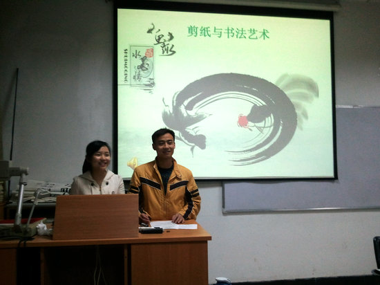 举办的新学期第一期汉语角活动如约和大家见面了。喜庆而又彰显中国传统文化的宣传板在校园里引来了不少驻足的目光——红红的嫁娘剪花图衬着潇洒苍劲的书法字体,让很多同学满怀期待。