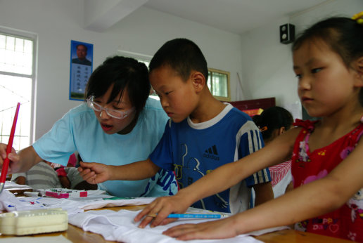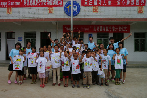 孩子们拿起支教团随行携带的T恤及颜料,眼睛里闪烁出兴奋与好奇。在老师的启发和指导下,美丽的线条与稚嫩的字体在素面的T恤上舞动了起来。“中国—我的母亲”、“请不要伤害小动物”、“自信的我”等等各具特色的创意,通过明快简单的图案,丰富又分明的着色,充分显示了少年的活力与梦想。很多营员将“Happy summer”英语夏令营的口号“快乐一夏,分享感动”的字样写在了T恤上,表达了对此次活动的喜爱。最后,孩子们自发地在操场上表演起了手绘时装秀,透过那些天真的笑脸,我们感受到了久违的童真。