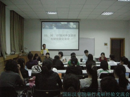06级学生在学习与考研复习中遇到的疑惑,对学生进行积极的学业引导与职业规划,并在对外汉语专业学生中形成良好的学习风气,经学院领导老师的大力支持、两届班委成员的精心组织以及05、06级学生的积极配合,一场令人期待的经验交流会于19日晚如期举行。