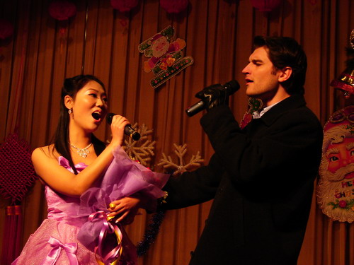 中西结合特点演绎的淋漓尽致;来自校团委的李亚云老师演唱了《大西北的鼓声》,充分表现了大西北人民的那种旷达、豪放的气概;在来自05级对外汉语班的欧阳莉和来自加拿大的郭峰的《今天你要嫁给我》之后,晚会进入了现场互动环节,观众们积极参与,认真回答问题,滑稽可爱的圣诞老人将礼物送给一个又一个幸运儿;互动环节结束后,来自越南班的现代舞《舞娘》将现场气氛带向了高潮;而晨星班的小品《圣诞节的来历》更是引得观众们哈哈大笑;来自韩国的留学生郑荣光演唱的《美丽的爱情》引得现场女同学发出阵阵的尖叫声;来自05级对外汉语班的拉丁舞,将现场的观众引向了神秘而又迷人的拉丁世界;在来自韩国的朴辅仁和来自澳大利亚的逯敏轩表演钢琴四手联弹《Flying Petals》时,原本热闹的会场迅速寂静了下来,观众们被美丽动听的音乐深深地打动;之后,52av