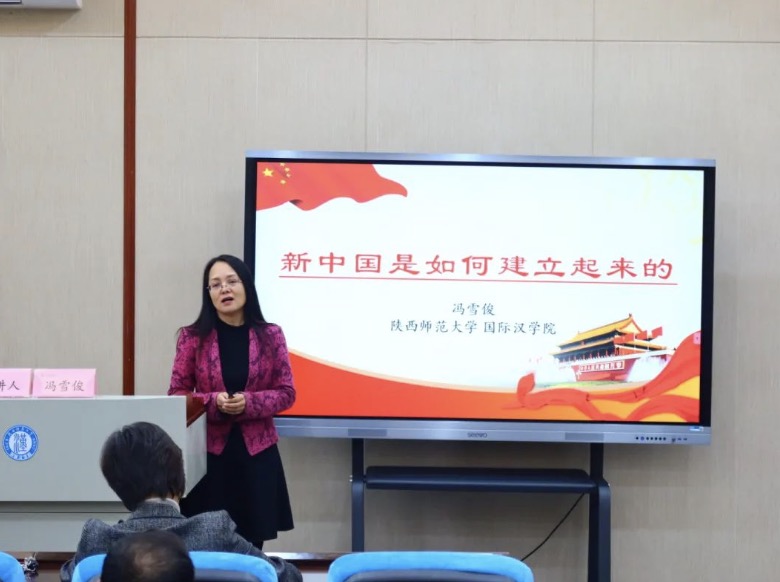 副教授冯雪俊主讲,党总支书记马兰主持,来自巴基斯坦、塔吉克斯坦、也门等十九个国家的70余名留学生参加了讲座。