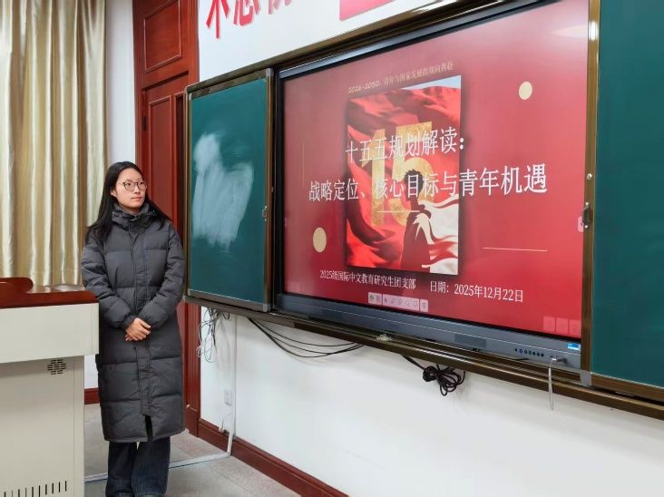 2025年12月22日,国际中文教育2025级研究生团支部组织开展了“十五五规划解读:战略定位、核心目标与青年机遇”主题团日活动,支部全体同学积极参与。活动聚焦新质生产力、绿色发展、科技自立自强、强大国内市场、对外开放等关键领域,结合中铝集团、天津港等青年团队创新实践案例,系统阐述了国家规划为青年群体带来的发展机遇与全新领域。在小组讨论环节,同学们围绕人工智能、智能制造等前沿科技,深入探讨了如何将人工智能与数字技术融入语言教学与文化传播,从而参与构建新型生产力和教育形态。各小组代表在总结发言中一致表示,要主动关注科技发展趋势,积极探索专业学习与创新应用的结合路径。