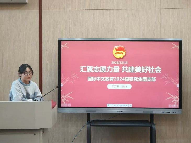 为深入学习贯彻习近平总书记关于志愿服务的重要指示精神,弘扬“奉献、友爱、互助、进步”的志愿精神,国际中文教育2024级研究生团支部于12月15日在教学二楼报告厅组织开展了“汇聚志愿力量 共建美好社会”主题团日活动。团支部书记张冰首先带领全体团员认真学习了习近平总书记致中国志愿服务联合会第三届会员代表大会的贺信内容。团员们深刻领会了贺信所强调的“传递真善美、传播正能量”的要义,以及志愿服务在强国建设、民族复兴伟业中的重要作用。结合党的十八大以来我国志愿服务事业的发展历程,大家进一步理解了党中央对志愿服务工作的高度重视与战略部署。在随后的交流分享环节,同学们踊跃发言,结合自身参与志愿服务、专业学习与实践的经历,畅谈学习体会。大家一致表示,作为国际中文教育专业的研究生,更应主动担当,将志愿精神融入专业使命,在传播中华文化、促进文明交流的实践中,坚持与祖国同行、为人民奉献,以实际行动展现新时代青年的责任与风采。