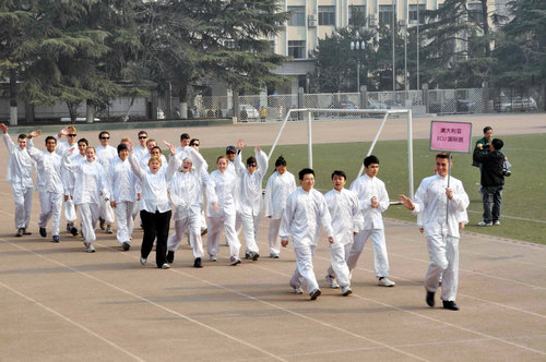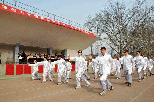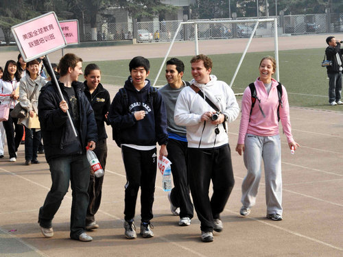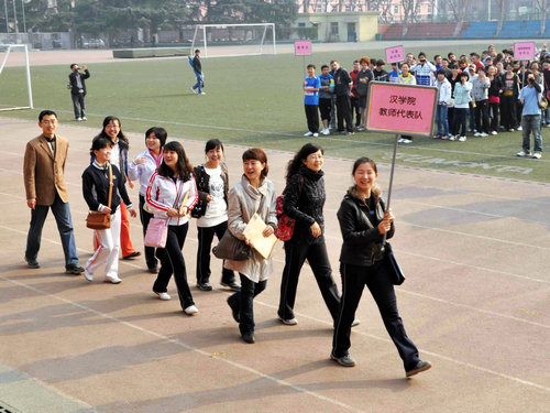 伴着运动员进行曲,由2007级对外汉语班、2008级对外汉语班、留学生普通班、留学生本科班、研究生班、澳大利亚埃迪斯科文大学短期培训班、美国教育联盟项目培训班7支队伍组成的方阵依次登场,向主席台上的老师领导挥手致意,展现各自风采。