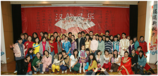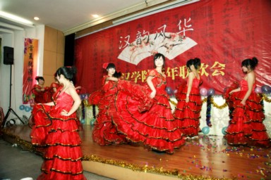 由韩国、香港、大陆的博士组成的合唱团通过耳熟能详的粤语歌曲向观众们送上了新年的祝福。学院青年教师与来自各国的留学生合唱了《橄榄树》和《北京欢迎你》,蕴含着对同学们的期许和祝福。“五洲汉儒”国际文化交流协会的中外学生共同演绎的歌曲串烧《我们的歌》更是精彩绝伦,激扬与优雅交错、高亢与舒缓并存,观众的欢呼声、赞叹声也伴随着旋律此起彼伏。2006级对外汉语的三句半表演《四大才子话师大》,贴合校园生活实际,语段诙谐幽默,掌声爆笑声迭起,将本次晚会推向了高潮。2007级对外汉语的红叶子合唱团为观众带来了探戈曲风的原创作品,展现了同学们独特的创作才华和对异域文化的领悟力,将晚会的气氛推向又一个顶点。在华丽而优雅的华尔兹服装秀中,联欢会进入了尾声。那些雍容华贵的汉服,那些英姿帅气的王子装,那些流动的光影以及每一个人脸上灿烂的笑容,共同铸就了此次晚会的成功。