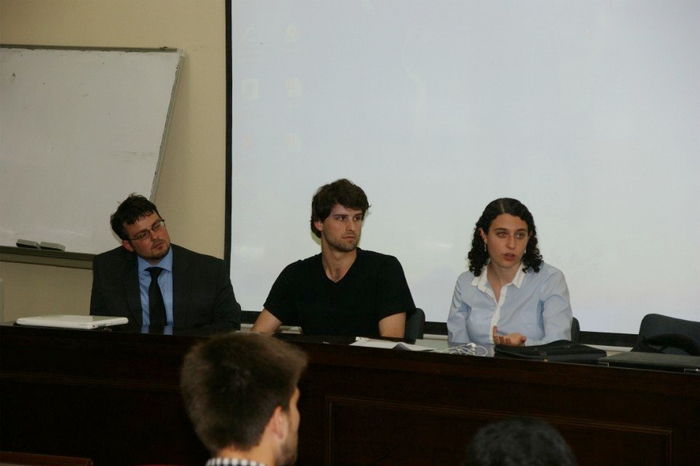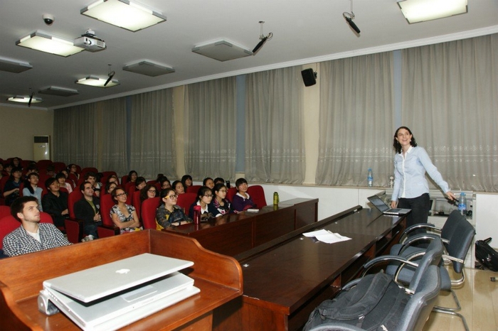 在读留学生,来自美国富布莱特奖学金项目的Cory Welch、Dylan Jeffers、Kathleen Naccarato等三位同学在进行了充分的社会调研基础上,分别以“中国当代艺术”、“西安化觉巷穆斯林建筑风格探究”以及“中国时尚元素”为课题向大家做了精彩分享,并与在场的同学们展开热烈讨论。在场的学生被美国留学生的严谨、认真和深入调查的态度所感染,美国学生也对中外学生对他们的调研报告提出的建设性建议表示感谢。