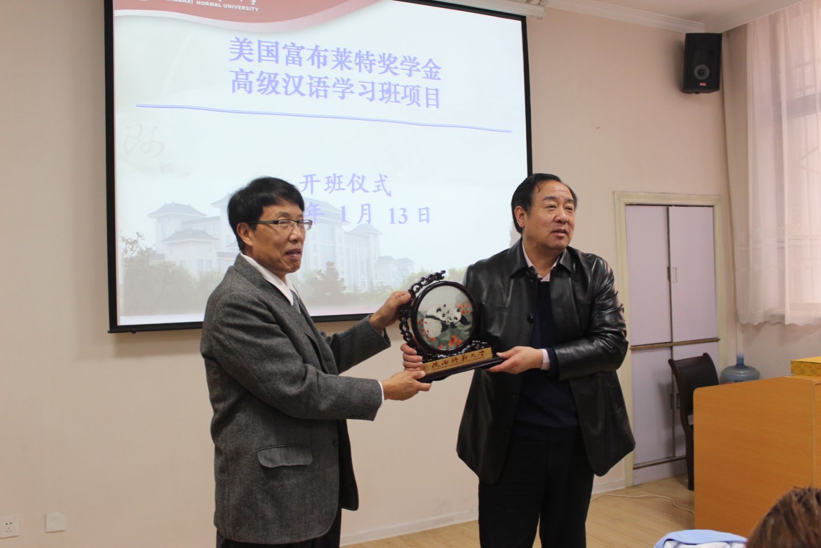 随后张建成院长为美国马萨诸塞大学波士顿分校中国项目中心主任胡万里老师赠送了陕西师大专门为该富布莱特项目定制一块大熊猫双面刺绣摆台,希望双方的交流与合作关系长久而巩固。