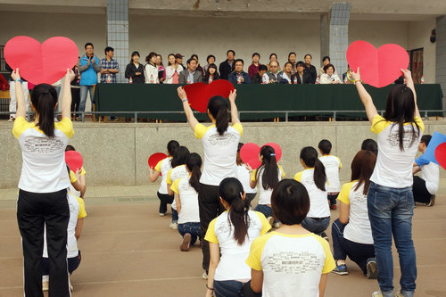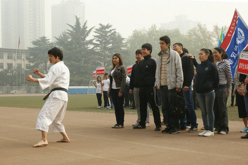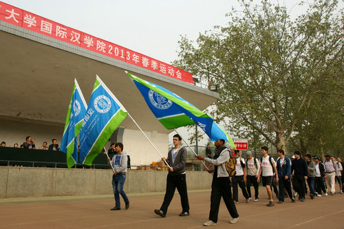 伴随着欢快的入场进行曲,来自哈萨克斯坦、美国、韩国、澳大利亚、土耳其、乌克兰等30多个国家的留学生和对外汉语教学专业的中国学生及教职工三百余人列队入场。他们有的动作整齐划一、有的带来欢快的舞蹈、有的喊着响亮的口号,2010级中国本科生还表演了独具特色的甩纸舞,现场气氛热烈欢快。
