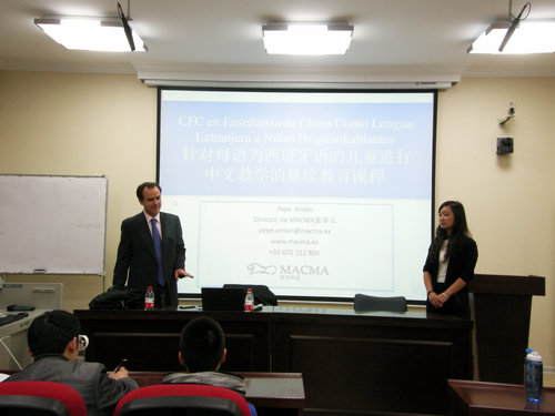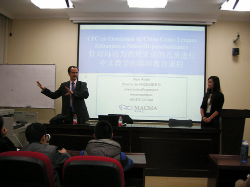 2011年12月27日,西班牙MACMA教育集团公司主管PEPE AMIAN先生在汉学院一层报告厅主持了2012年马德里自治大学对外汉语教师资格课程带薪实习项目说明会。