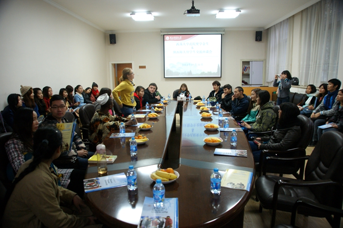 来自西南大学的近40名孔子学院奖学金生与我校部分留学生代表进行了温馨愉快的茶话会。他们在互相介绍之后,畅谈了来华学习的感受以及未来的职业发展规划。会谈结束后,我校留学生热情带领西南大学留学生参观了雁塔校区。