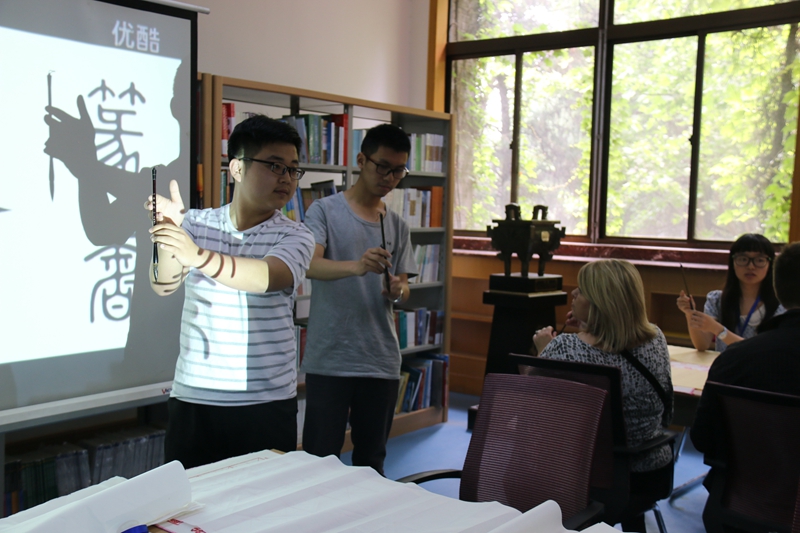 学生社团五洲汉韵在二层阅览室接待了来中国游学的美国北达科他州立大学师生,为他们展示了一堂精彩的中国书法艺术体验课。