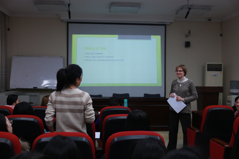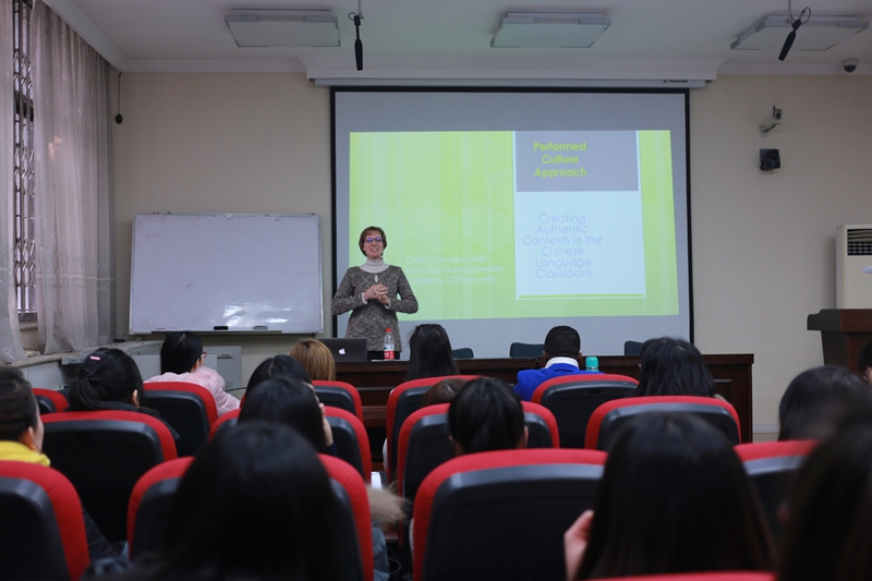 Crista Cornelius女士首先总体上介绍了“Performance教学法”,不同于传统的教学法,它更加注重为学生创建一个真实有效的交际语境。