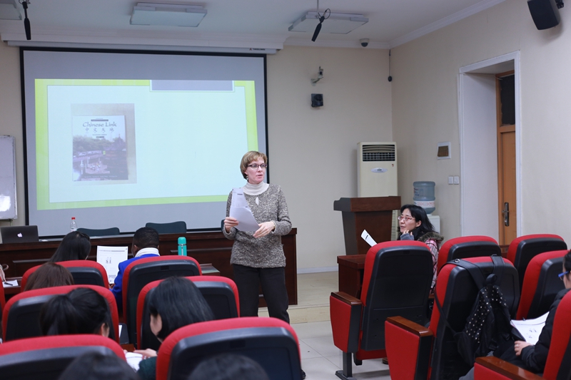 然后,Crista Cornelius女士为大家介绍了两种汉语教材,并带领大家进行教材分析,找出了这两种汉语教材在语境上的缺陷和不足,并让大家针对发现的问题利用“Performance教学法”理论进行修改(Creating Authentic Contexts)。最后,Crista Cornelius女士针对大家的疑问进行了答疑。