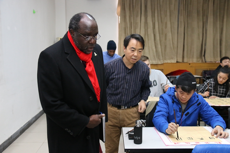 留学生中国民族舞及书法选修课,与学生亲切交谈。