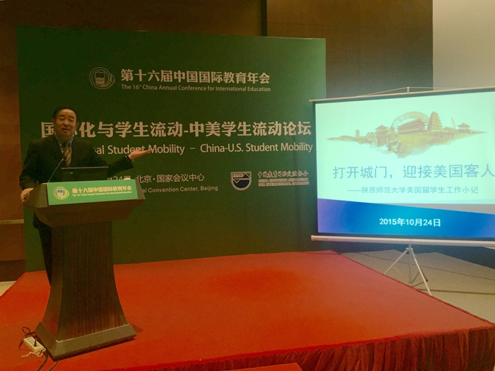 美国留学生工作小记”的演讲,赢得全场嘉宾阵阵掌声。他介绍了陕西师大来华留学生工作的历史沿革、特色活动及品牌服务,并着重通过对美国留学生项目的梳理,展现了我校来华留学生招生与培养管理工作的特色,得到了与会嘉宾的高度评价。