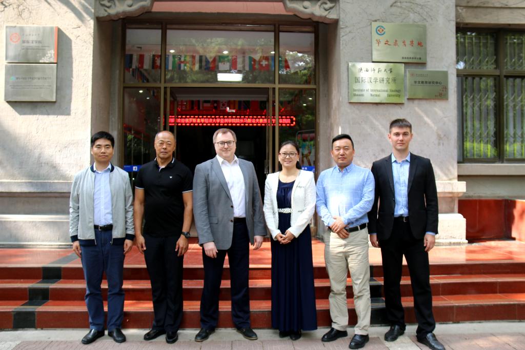 副院长吴媛、留学生管理办公室主任朱卫强、留学生管理办公室工作人员及我校俄罗斯籍留学生与马斯洛夫教授一行在52av