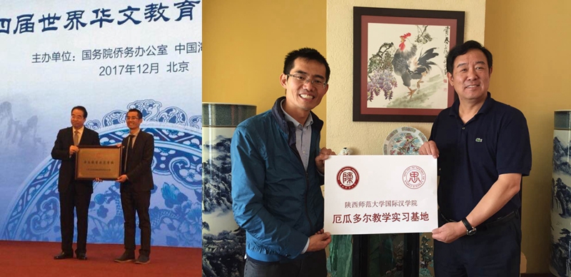 我校校友曹孝宏,1997年毕业于我校英语系,2002年只身移居厄瓜多尔,该国虽处南美,但随着中国日益强大,中资企业在厄瓜多尔有了长足发展。当地人对中国文化兴趣日浓,华人华侨子女学习汉语的愿望日渐增加,曹孝宏于是在2004年在首都基多开办了厄瓜多尔第一个华文教育机构思源中国语学校。通过不懈的奋斗,学校规模从最初租一间房子到现在已有两个独立校区。在中国驻厄使馆及国家国务院侨办的关注和支持下,思源中国语学校在厄瓜多尔已成为一个知名度非常高的传播中国语言及文化的学校,也成为沟通中资企业和陕西与厄国合作的桥梁。2016年11月习近平主席访厄期间,思源中国语学校的华人学生参加接待并表演了节目。中央电视台四套《华人世界》专门报道了“筑梦一带一路,曹孝宏在厄瓜多尔教中文”的事迹,习近平主席及夫人与思源中国语学校的老师代表合影留念。基于思源中国语学校的办学成就,本届世界华文教育大会授予思源中国语学校“华文示范学校”称号。同期在中央电视台四套播放的《华校掠影》第三集《梦想》中,专门介绍了曹孝宏及他创办的思源中国语学校,片中曹孝宏表达了他对故乡陕西及母校的深深眷恋之情。