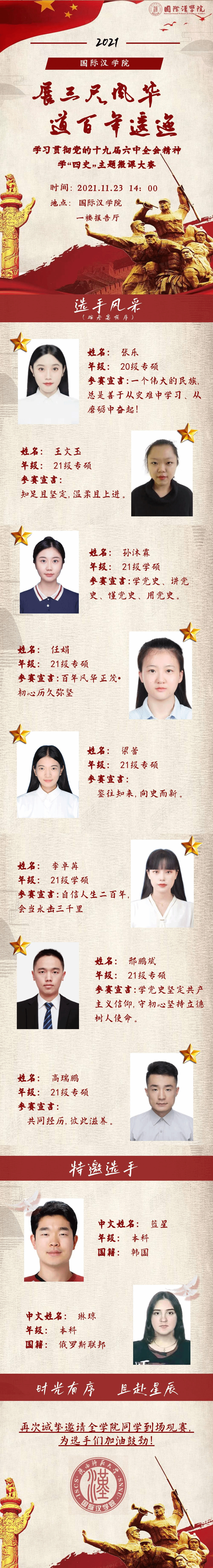 以下是参加比赛的八位选手,他们或青春洋溢,或激情澎湃,将“四史”故事娓娓道来。本次大赛我们还邀请了国际生作为“特邀选手”,讲述他们与中国的故事!