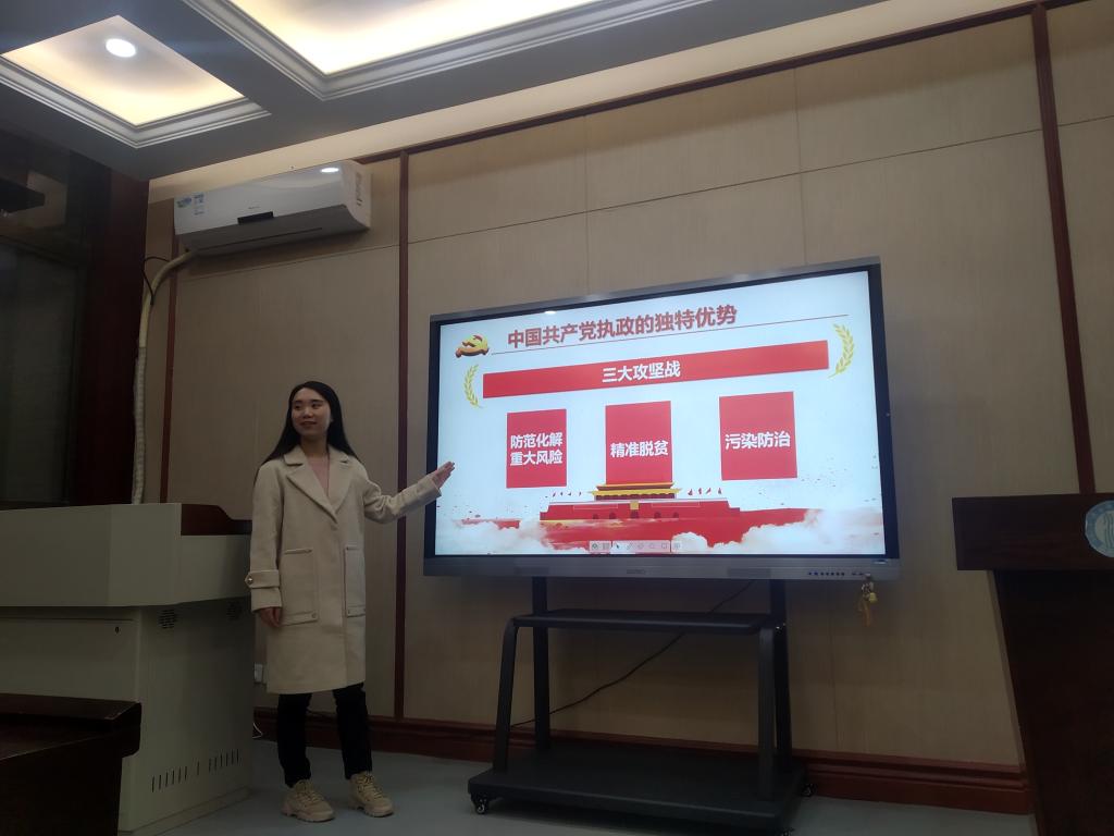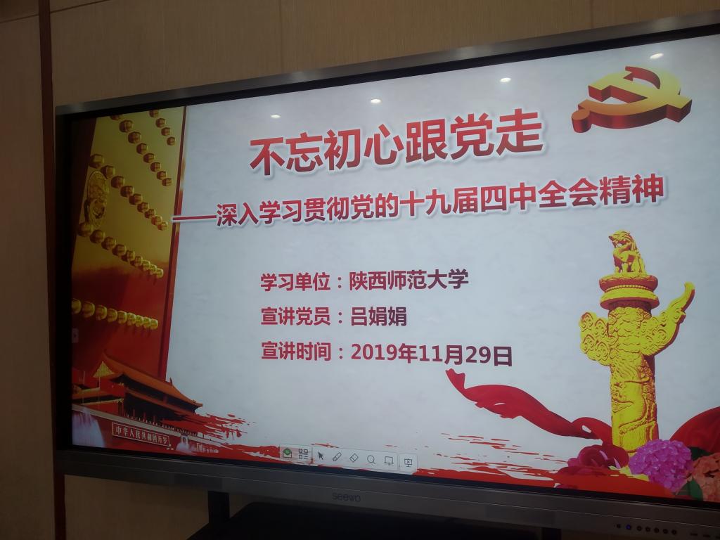 研究生第二支部党员吕娟娟同志以“不忘初心跟党走”为主题,从十九届四中全会通过的重要文件、总体目标、党的初心和使命、中国共产党执政的独特优势等方面对十九届四中全会的精神进行解读,通过讲述户县玉蝉镇涝峪口村低保贫困户安闯娃脱贫致富的故事来突出中国共产党执政的独特优势,在共产党的领导下,我国的贫困人口锐减,中国的脱贫工作赢得了世界的喝彩,始终坚持党的领导,才能确保国家始终沿着社会主义方向前进,才能发挥社会主义制度的优势,办好中国的事情,关键在党。