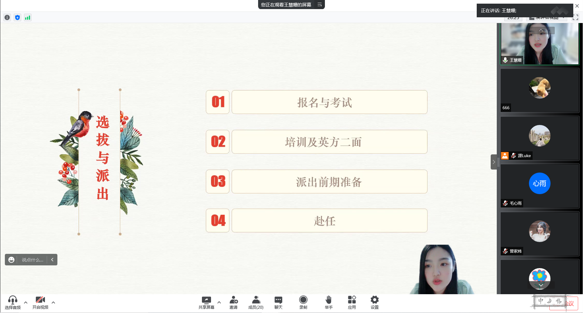 5名已完成服务任务的志愿者们,以及顺利通过2022年志愿者选拔的两名同学分别就考试准备、派出手续办理及志愿者工作与生活等方面分享了自己的经验与体会。