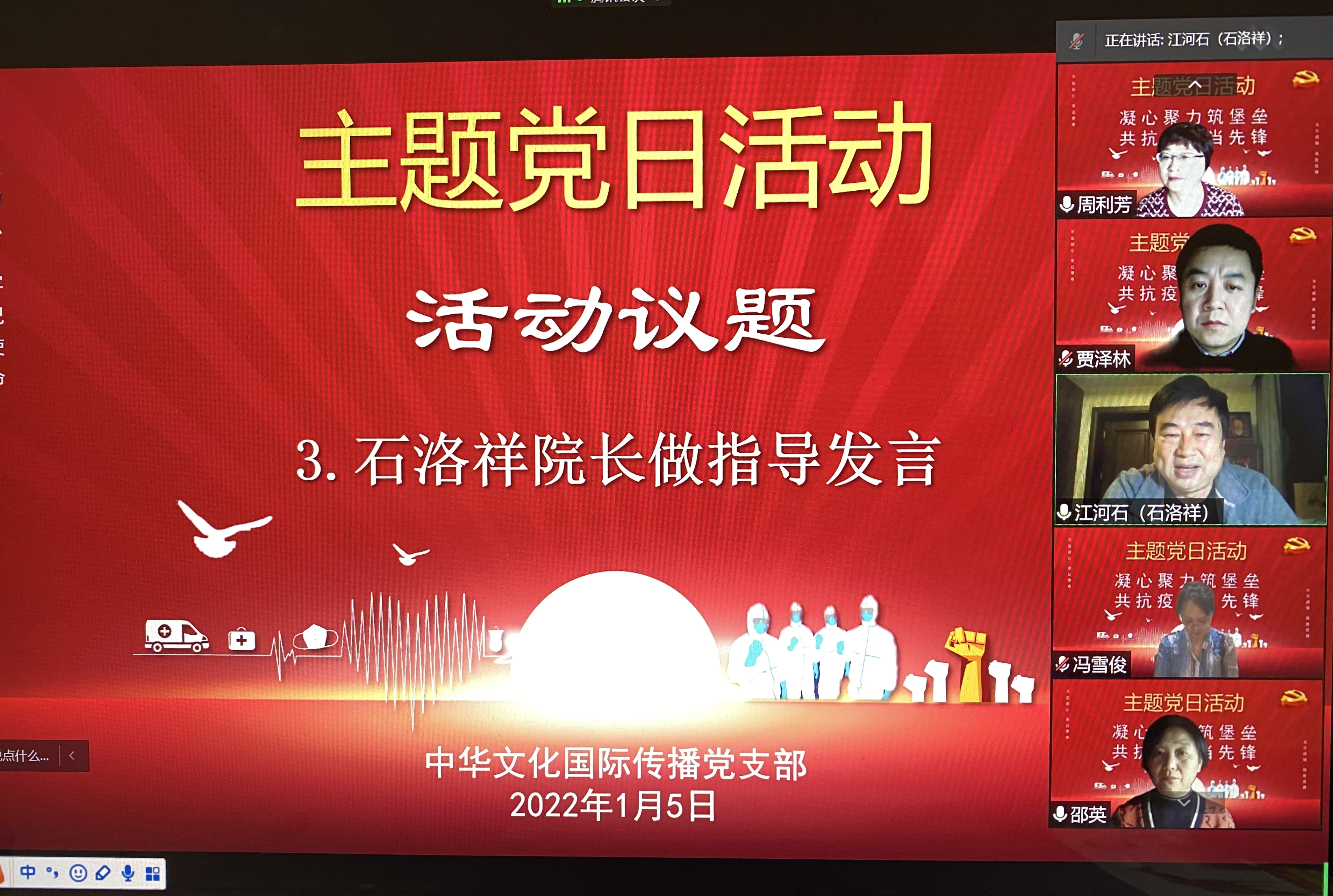为了全面发挥教师党支部的战斗堡垒作用和教师党员的先锋模范作用,为坚决打赢疫情防控阻击战提供坚强的组织保证,2022年1月5日晚上,中华文化国际传播党支部全体党员汇聚云端,开展了“凝心聚力铸堡垒,共抗疫情当先锋”主题党日活动。活动由支部书记邵英主持,52av