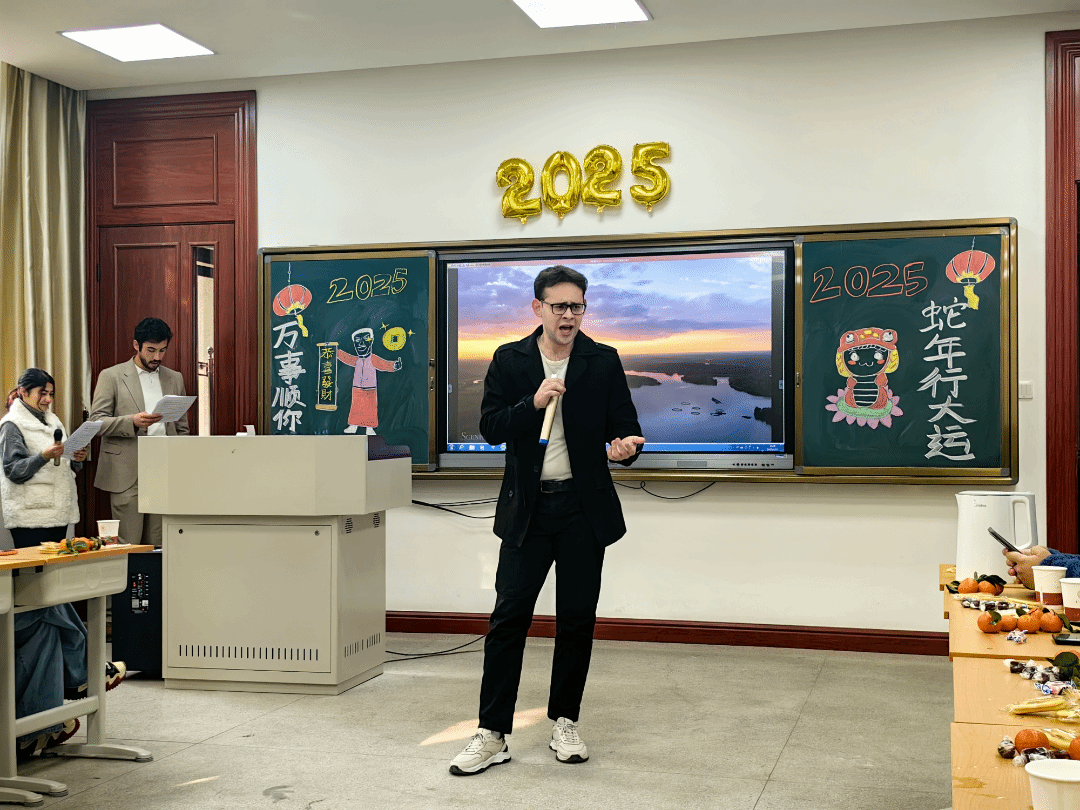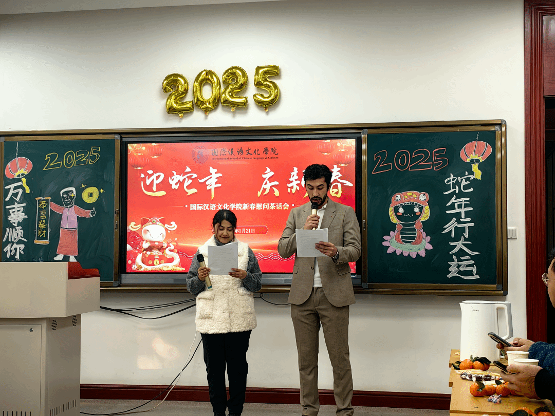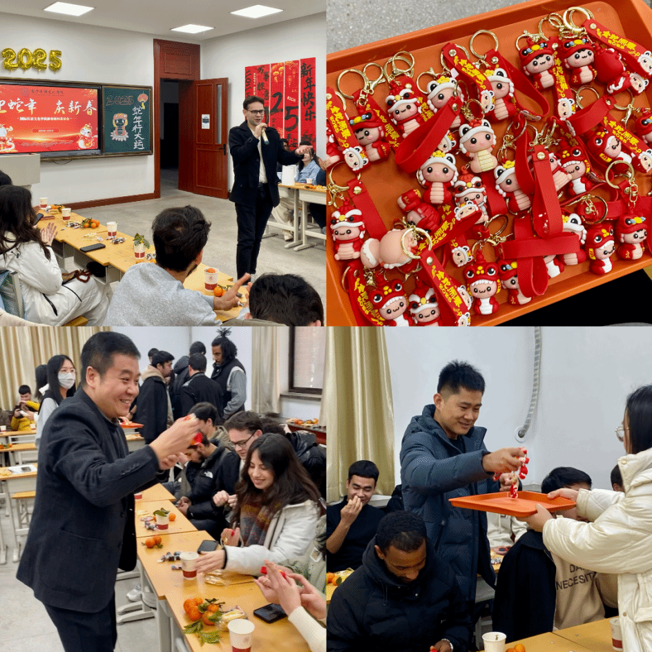 举办新春慰问茶话会,1月21日下午学院一层教室洋溢着节日的喜庆氛围,学院党总支书记马兰、副书记张昊、副院长贾泽林、副院长孙建伟、团委书记翁思洁、国际学生辅导员张欣元和来自二十多个国家的留校国际学生欢聚一堂,共同感受节日的浓厚氛围,深入了解春节文化知识。