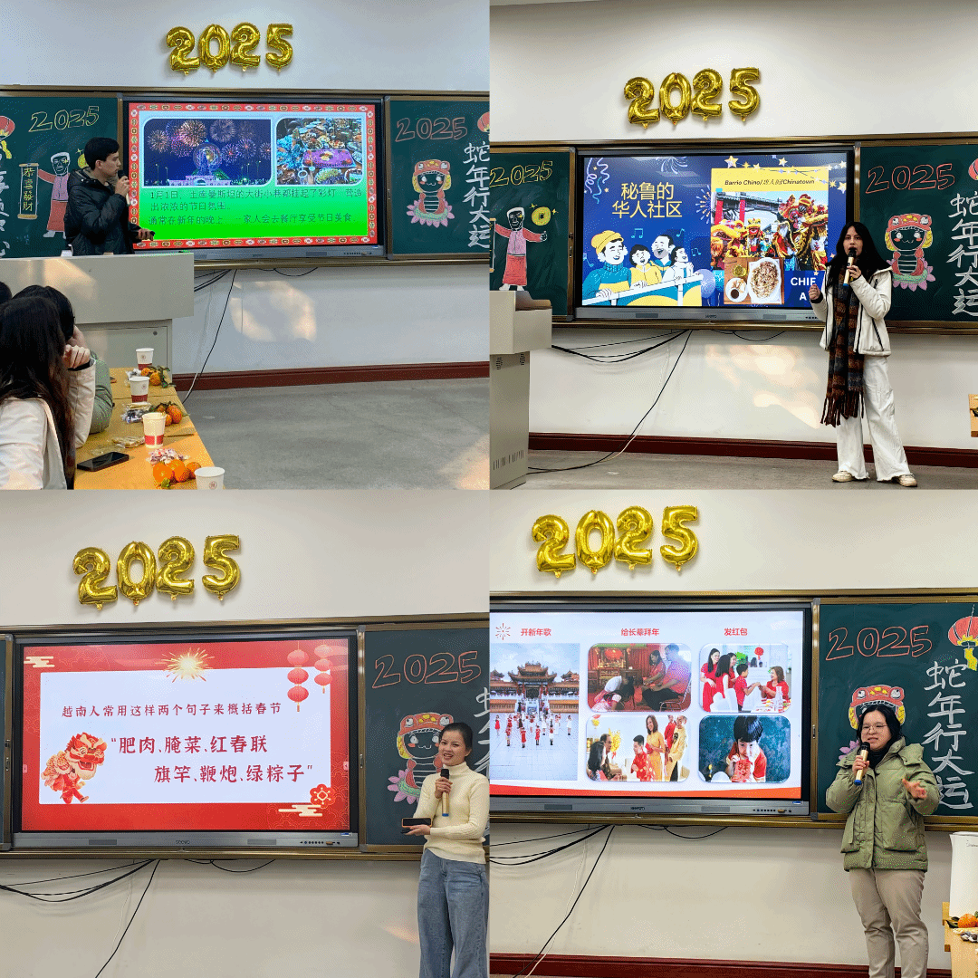 随后,四名留学生依次分享本国新年文化。土库曼斯坦的李尔迪同学介绍了土库曼斯坦的公历新年和诺鲁孜节,分享了节日美食和图塔尔乐器;秘鲁的林梦雅同学讲述了秘鲁人穿白衣庆新年、吃十二颗葡萄许愿的习俗,以及融合中秘两国烹饪技巧的特色美食Chifa;越南的陈映雪同学介绍了越南当地华人庆祝春节、财神节、元宵节的特色习俗,她还祝贺中国春节列入世界非遗名录;最后朱芳芳同学介绍了自己家中庆祝春节的特色活动,既有中国传统文化习俗,又融入了印度尼西亚和马来西亚的风俗。